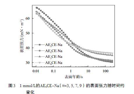 前面已经讨论了溶液平衡时的特性与规律,但没有考虑平衡及老化的时间,而时间因素在实际应用中起着决定性的作用。当表面活性剂分子从本体相迁移到表面时,分子的动态吸附性能会影响表面活性剂的性能。因此,如图3所示,测试了1 mmol/L的不同EO加合数的AEnCE-Na的表面张力随时间的变化曲线。