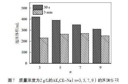 图7质量浓度为2 g/L的AEnCE-Na(n=3,5,7,9)的泡沫体积