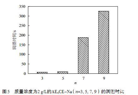从图5中可以得到,AEnCE-Na的润湿时间随EO加合数的增大而增大,也就是说,润湿能力随EO数的增大而逐渐减弱,这主要是亲水性增强的结果。其中,AE3CE-Na和AE5CE-Na的润湿时间均小于10 s,样品的润湿性能较好。