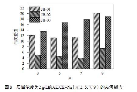 洗涤剂在生活和生产中都扮演着重要的角色,而表面活性剂是各种洗涤剂的主要成分。因此,测试了JB-01,JB-02及JB-03三种污布在不同EO加合数的表面活性剂溶液AEnCE-Na中洗涤前后的白度值,并将同一块污布在洗涤前后的白度值作差,得到如图8所示的结果。