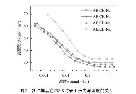 分子定向吸附到气/液界面高效降低溶液的表面张力是表面活性剂的一大特性,表面张力的数据也是研究表面活性剂在界面的组成及自身的结构和性能的基础。因此,探究了不同EO加合数的AEnCE-Na的表面张力与浓度的关系,结果如图2所示。由图2可以看出,溶液的表面张力随浓度的增大先急剧下降后基本保持不变,此外,还可以得到临界胶束浓度(cmc)和临界胶束浓度对应的表面张力(γcmc)。表面活性剂分子在气/液界面的最大吸附量(Γmax)、每个分子所占的最小截面积(Amin)及表面张力降低20 mN/m所需浓度的负对数(pc20)可以通过公式1)~3)计算得到。