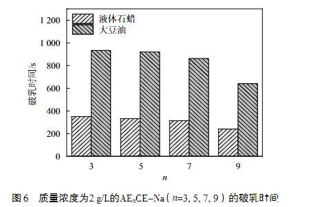 表面活性剂的另一大用途是通过降低油/水界面的界面张力而用作乳化剂,稳定存在的乳液被广泛应用于食品、药品和个人护理等方面。因此,测试了不同EO加合数的AEnCE-Na对大豆油和液体石蜡的破乳时间,结果如图6所示。