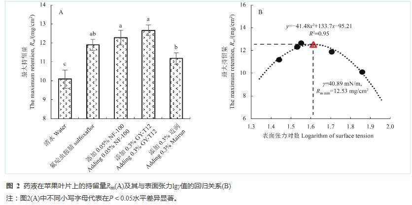 2.4添加助剂后药液在苹果叶片上最大持留量及与表面张力的关系