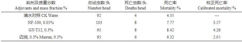 调查了NF-100、GY-T12和迈润3种助剂对苹果黄蚜的致死率。结果(表3)显示:在本研究剂量下3种助剂处理的死亡率均小于10%,各处理间无显著差异,清水对照校正后死亡率为2.05%~4.26%,因此可以忽略助剂本身对苹果黄蚜的毒性。在此基础上,分析了3种助剂对氟啶虫胺腈的增效作用,结果(表4)表明:未添加助剂时,氟啶虫胺腈对苹果黄蚜的LC50值为19.35 mg/L,添加GY-T12、NF-100和迈润后,对苹果黄蚜的LC50值分别为9.36、13.06和14.35 mg/L,相对毒力指数(T)分别为2.067、1.481和1.348,均大于1.20,表明3种助剂均对苹果黄蚜有增效作用;由LC50值的95%置信限可以看出,添加GY-T12的处理与氟啶虫胺腈单剂无重叠,表明GY-T12可显著提高氟啶虫胺腈对苹果黄蚜的毒力。