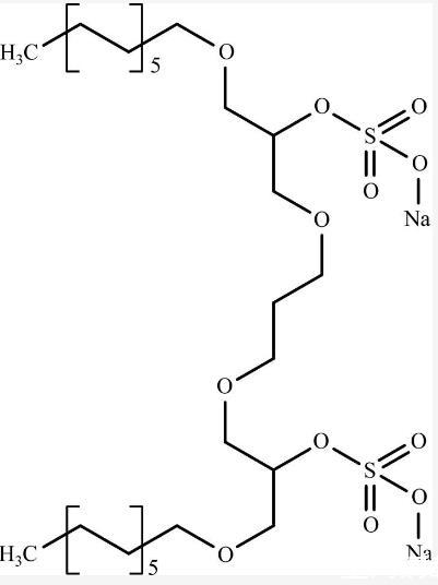 亲油基碳数过高或过低的表面活性剂的起泡能力都不高,12个碳的直链亲油基有利于提高半衰期,增强泡沫稳定性。煤表面存在含氧官能团,包括醇、醚、酚、酯、羧基,可使煤粒子表面带负电荷。阳离子型表面活性剂由于氢键和静电的双重作用可被煤表面选择性吸附,吸附强度高,不利于其在煤岩表面脱附。而阴离子型表面活性剂可通过氢键作用力吸附在煤岩上,但引入的负电基团的静电斥力会减弱其与煤层的氢键作用,使其排水降压开采时易于脱附,有利于储层保护?;谏鲜鲈恚葱律杓频男滦退悠鹋菁罸LT-1的分子结构见图1。