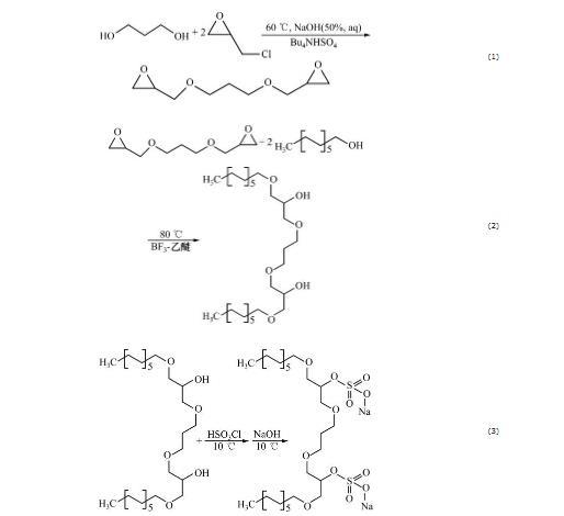在三口烧瓶中加入1,3-丙二醇、环氧氯丙烷和四丁基硫酸氢铵,在40~50℃下搅拌。用恒压滴液漏斗滴加质量分数为50%NaOH水溶液,继续在40~60℃搅拌2 h。用分液漏斗分出上层有机相,加入乙醇,热过滤除去无机盐,旋蒸除去乙醇和环氧氯丙烷,干燥得到环氧醚。在三口烧瓶中加入1-十二醇,BF3-乙醚溶液,搅拌片刻升温至30~40℃,在搅拌条件下逐滴加入上步产物环氧醚,滴完后升温至60~80℃,搅拌5 h,用分液漏斗分出上层有机相,旋蒸除去十二醇和环氧醚,干燥得到醇醚。在三口烧瓶中加入上步产物醇醚,搅拌,在10~20℃时非常缓慢地滴加氯磺酸,采用尾气回收装置除去氯化氢气体,搅拌3 h,加入乙醇,热过滤除去无机盐,旋蒸除去乙醇,干燥得到最终产物起泡剂ULT-1。反应原理如下列: