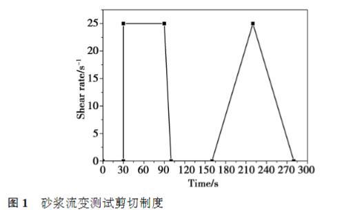 砂浆的流变测试使用Brookfield R/S SST2000流变仪,将测试流动度之后的砂浆立即置于流变仪中,选定设置好的剪切制度后开始测试,剪切制度设置如图1所示。具体过程描述如下:静置30s后,在剪切速率25s?1下匀速预剪切60s;然后剪切速率在10s内匀速下降至0s?1;静置60s后,剪切速率以斜坡式在60s内逐渐从0s?1提高至25s?1,然后再以斜坡式在60s从25s?1下降到0,采集60个数据点。采用剪切速率从25s?1下降到0s?1的过程中的屈服应力和表观黏度作为分析砂浆流变性能的数据。