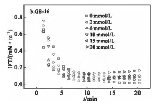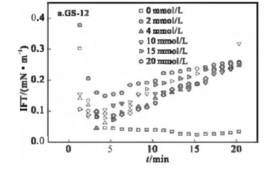 表面活性剂/油体系的动态界面张力行为,对驱油过程具有重要意义。动态界面张力是驱油过程中各种复杂物理化学反应的具体体现。因此,研究动态界面增长力及其影响因素非常重要。溶液中离子强度增加,将影响表面活性剂分子在水相中的溶解度,改变双电层参量,而导致油水界面表面活性剂浓度的改变。一般情况下,添加的盐可以通过中和表面活性剂分子在界面上头基的电荷来减弱表面活性剂分子之间的静电斥力,导致IFT降低[5]。温度为30℃下,不同KBr盐浓度下,GS-12,GS-16的煤油/表面活性剂溶液界面张力随时间的变化曲线见图6。
