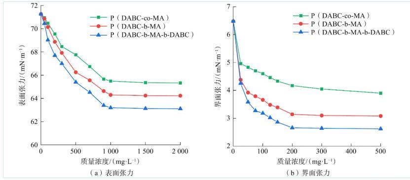结果表明,所有共聚物均能有效降低表界面张力,具备两亲性。但嵌段共聚物,特别是三嵌段结构,降低张力的能力和效率显著优于无规共聚物。