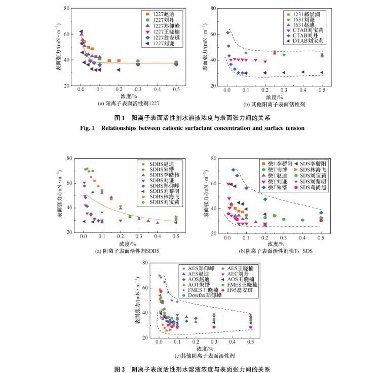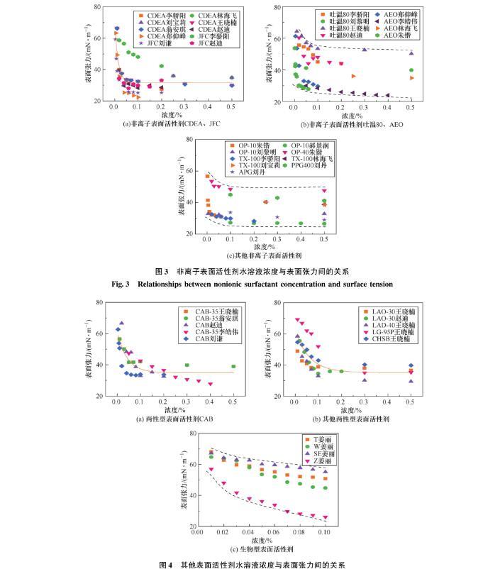 采用文献调查法,汇总分析了82组不同类型表面活性剂水溶液浓度与表面张力的对应关系[19-34],如图1~图4所示。