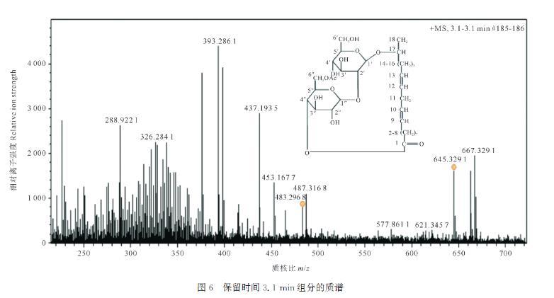 保留时间为3.1 min时色谱峰丰度最高。对该物质进行详细分析,质荷比(m/z)645.32的碎片为单乙?;〈哪邗バ突碧侵姆肿永胱臃澹琺/z 667.32为[M+Na]+峰,m/z 483.29为[M+H-C8H12O6]+峰,其中C8H12O6为乙?;〈腔?。上述分析表明此物质为内酯型槐糖脂,具体名称为:17-L-[(2'-O-β-D-吡喃葡萄糖基-β-D-吡喃葡萄糖基)-O-]十八二烯酸-1',4″-内酯-6″乙酸酯。