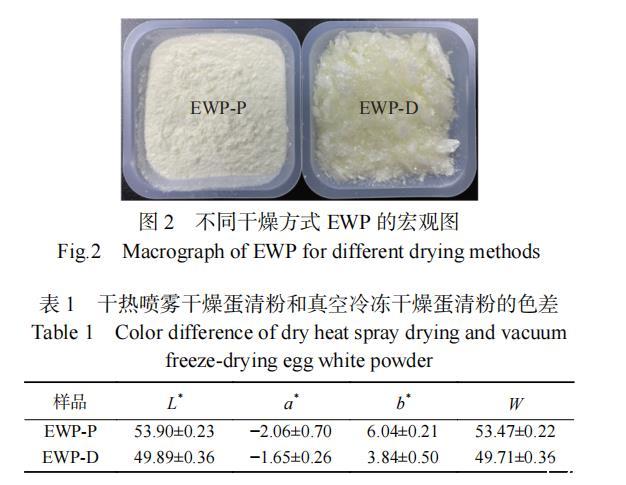 如图2所示,EWP-P为细腻的鹅黄色颗粒粉末,EWP-D为松散的黄色片状物。EWP-P的L*、a*和b*值分别为53.90±0.23、?2.06±0.70和6.04±0.21。EWP-D的L*、a*和b*值分别为49.89±0.36、?1.65±0.26和3.84±0.50(表1)。EWP-P的b*值较大是因为蛋清蛋白中的葡萄糖在喷雾干燥过程中与蛋白发生了美拉德反应。此外,真空冷冻干燥需将样品进行冷冻预处理,冷冻过程中,蛋清蛋白会发生褐变反应,故EWP-D最终呈现出的颜色较EWP-P黄(图2)。EWP-P的颜色较EWP-D白(图2),可能是因为干热喷雾干燥的干燥速度快,蛋清中的蛋白质受热时间短。因此在本实验干燥条件下,干热喷雾干燥所得的蛋清蛋白粉更亮、更白,易被消费者接受。