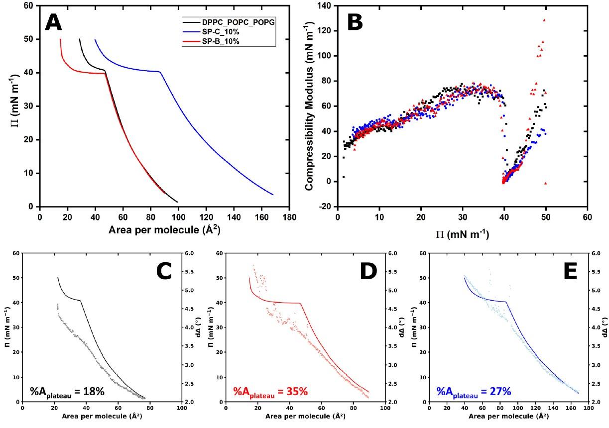 LB膜分析仪可获取表面压力-面积(Π-A)等温线,直接用于测量模型单层膜(纯脂质、脂质+SP-B、脂质+SP-C)的压缩Π-A等温线。等温线显示,所有系统在压缩至约40 mN/m时均出现一个明显的平台区,这对应于单层膜从二维向三维结构的转变(buckling-dominated collapse),模拟了生理呼气末期的膜重组过程。通过计算平台区压缩面积占总面积的百分比(%Aplateau),研究人员量化了SP-B和SP-C在稳定三维结构能力上的差异。结果表明SP-B系统的%Aplateau(35%)显著高于SP-C系统(27%)和纯脂质系统(18%),直接证明了SP-B在促进和稳定膜储备库形成方面具有更强大的能力。与椭圆偏振测量联用,研究中,将Beaglehole Picometer Light Ellipsometer与Kibron G2槽联用,实时监测压缩过程中光学参数d△的变化。