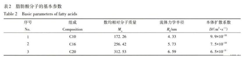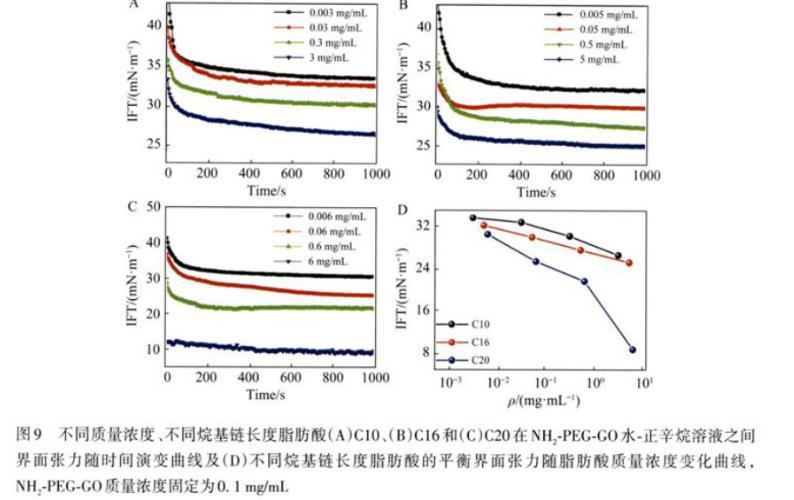 对比不同链长脂肪酸在不同质量浓度时的动态界面张力(图9A-9C),发现虽然脂肪酸在正辛烷中的扩散系数随着碳链的增长而减?。ū?),但添加高质量浓度C20酸时,界面张力值到达平衡的时间明显缩短,这表明脂肪酸烷基链长度会影响脂肪酸在界面的性质。并且发现脂肪酸烷基链越长,与NH2-PEG-GO协同稳定的水-正辛烷界面张力越低。并且随着脂肪酸质量浓度增加,烷基链链长增加对界面张力降低效果越明显(图9D)。