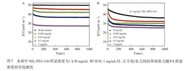 图7水相中NH2-PEG-GO质量浓度为(A)0 mg/mL和(B)0.1 mg/mL时,正辛烷/水之间的界面张力随PA质量浓度的变化曲线